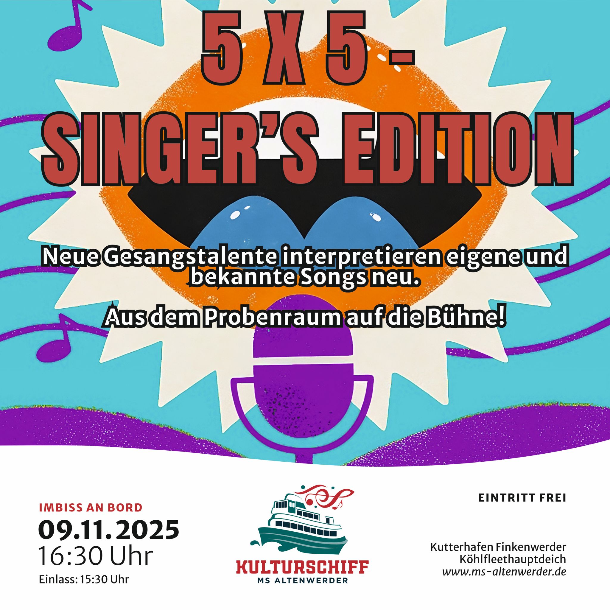 5x5 Singers' Edition 2025 Jeder fängt mal klein an.... diese Gesangstalente haben im Gesangsunterricht auch mal so angefangen, aber nun sind sie mehr als einfach nur bereit für die Bühne! Neue Gesangstalente - fünf Stimmen - singen je fünf Songs - von „selten“ über „Geheimtipp“ bis hin zu Eigenkompositionen...minimalistisch, solo begleitet, durch ein Instrumental vom Band ergänzt oder als ganze Band. Sie interpretieren auch bekannte und nicht so bekannte Songs neu und zeigen, was in ihnen steckt. Coverstücke & Neues über alle Genres…Oldies, Blues bis Heavy Metal, uvm.